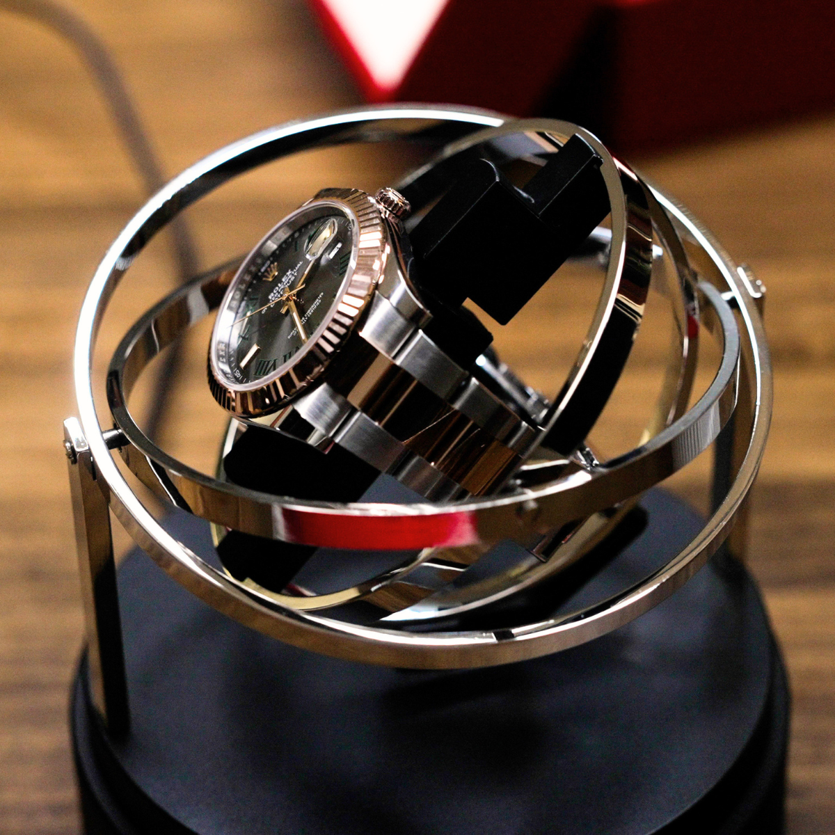 Le mouvement gyroscopique dans un remontoir fait référence à une rotation tridimensionnelle, qui permet à la montre de tourner sur plusieurs axes. Ce type de mouvement simule plus précisément les mouvements naturels du poignet, assurant un remontage homogène et constant du mécanisme automatique de la montre. Il permet également de mieux répartir les forces sur les composants internes, garantissant ainsi un remontage plus efficace et une protection accrue du mécanisme.